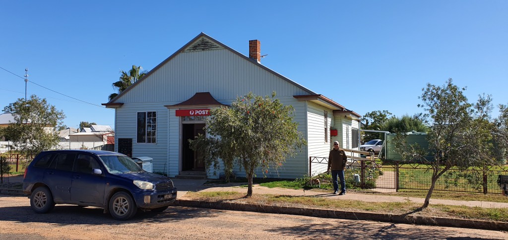 From Barkala Farm, we go to find the place where Ted lived until he was six, in Pilliga when his young father was rising in the Commercial Banking Co, (now the NAB) and he was given his first manager’s job – in Pilliga. Arriving in Pilliga, we go to the Post Office to ask where the old bank might be, only to find that we are standing in it – the very building where Ted slept as a toddler!