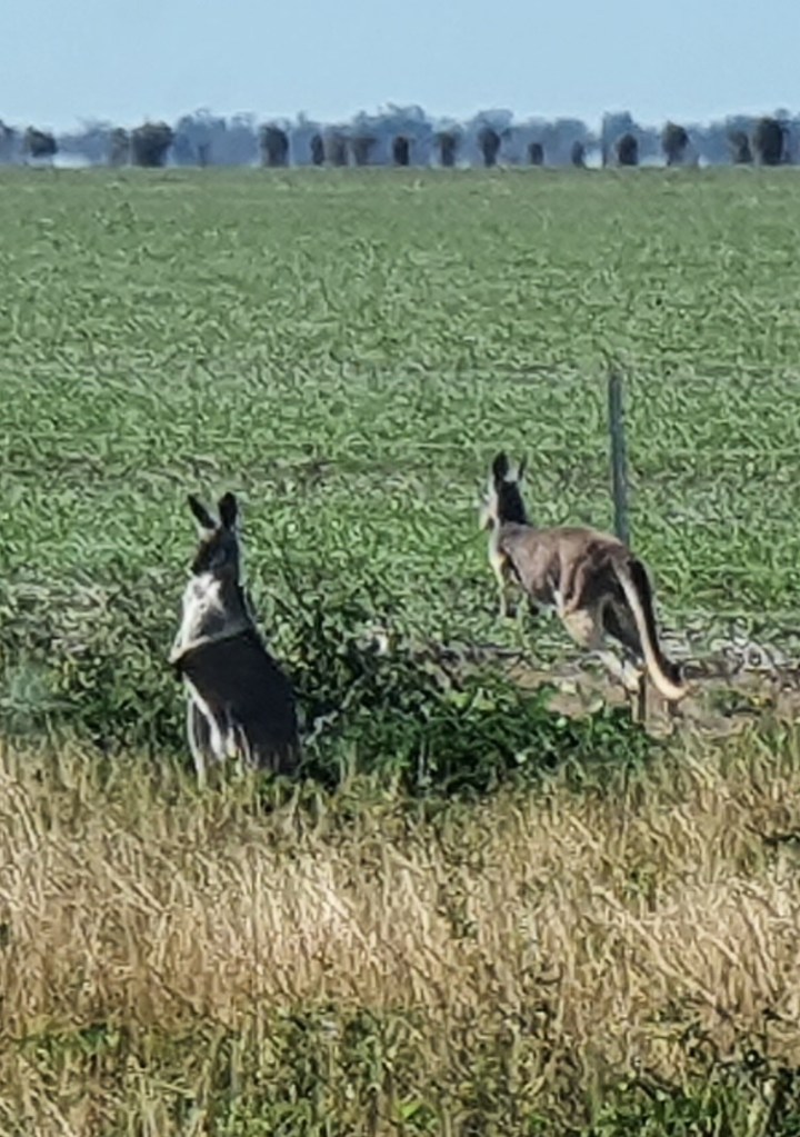 We find a pleasant tree-lined spot just out of town in a Rotary Park, with a lagoon spread with tall reeds, a spouting fountain and a prolific birdlife – friendly domestic ducks and drakes wanting a feed. An early morning walk with Charlie is enlivened by a chat with ‘Les’, my new second-best friend, driving a B-Triple, who cheerfully tells me the story of his lifestyle on the road between Swan Hill and Dirrambandi.