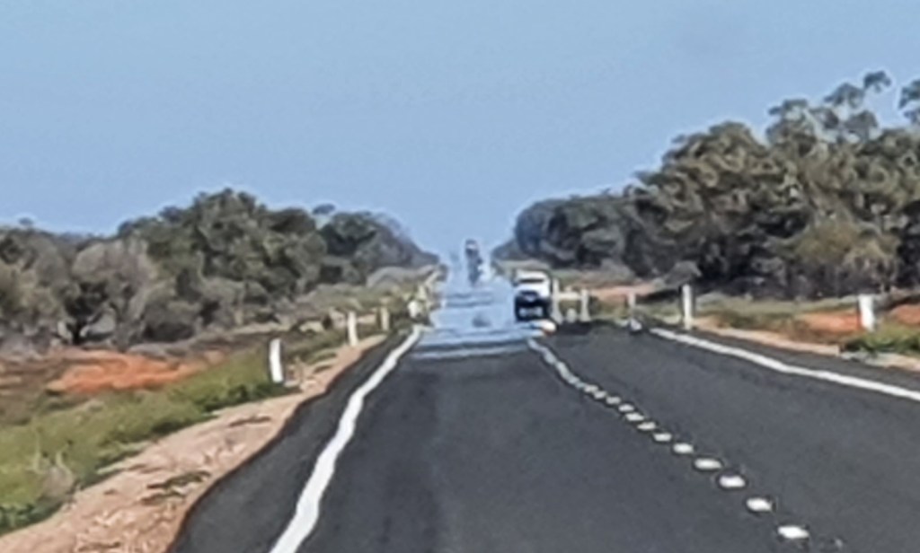 We’ve been driving under gray skies for so long it’s pure delight as we break out of the clouds into blue and white skies and splendid sunshine. These people out here aren’t very good at corners – the roads are still ramrod straight, although the salt bushes are getting smaller and the trees more sparse. We’re getting used to the mirages on the road – amazing to us town dwellers. For a while there are wild goats everywhere, occasionally crossing the road just as we arrive. There are sheep too – black faced and spread across vast spaces – no grass, just small nameless (to us) plants and the inevitable blue grey salt bush.
