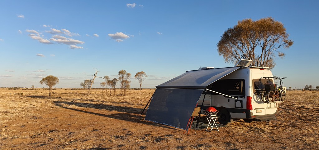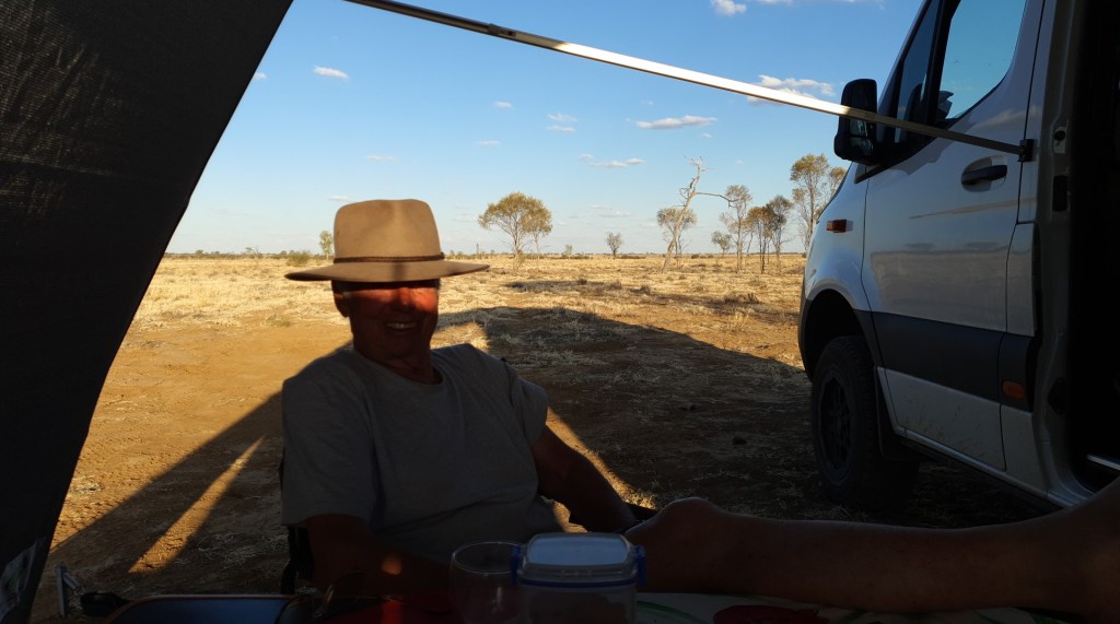 We do finally drag ourselves away to another ‘cattle’ station (no cattle, fences fallen down)outside Longreach – the drought has really not gone away here and we camp in a desert – fantastic experience – there’s nothing to stop the wind, so the middle of the night sees us up taking in the awning – just like being on the boat again!