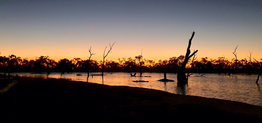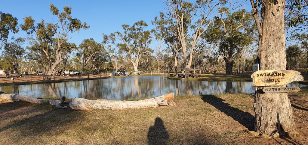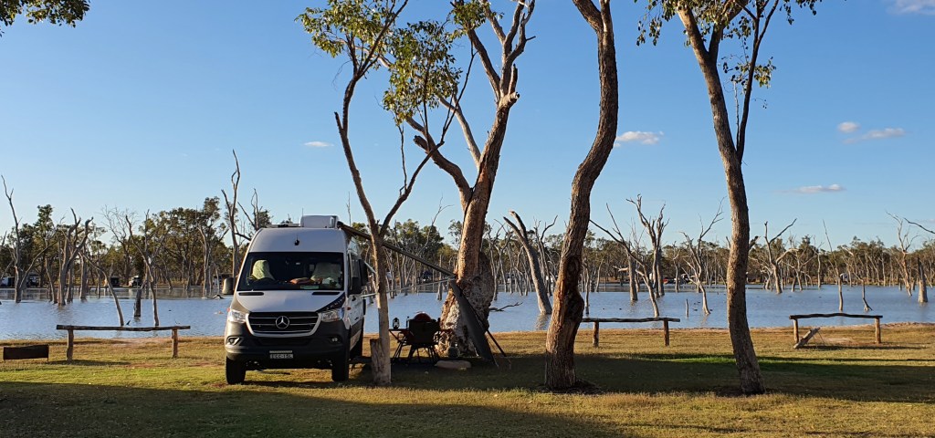 We reach Lara Wetlands, a large Artesian pond, four kilometres in circumference, fed by spouting Artesian waters. The waters, full of dead trees, have provided homes for thousands of birds and it has become a drawcard for bird watchers. The pond where the almost boiling water spouts provides a hot spa bath, great for recovering backs. We go there twice a day and can hardly drag ourselves away.