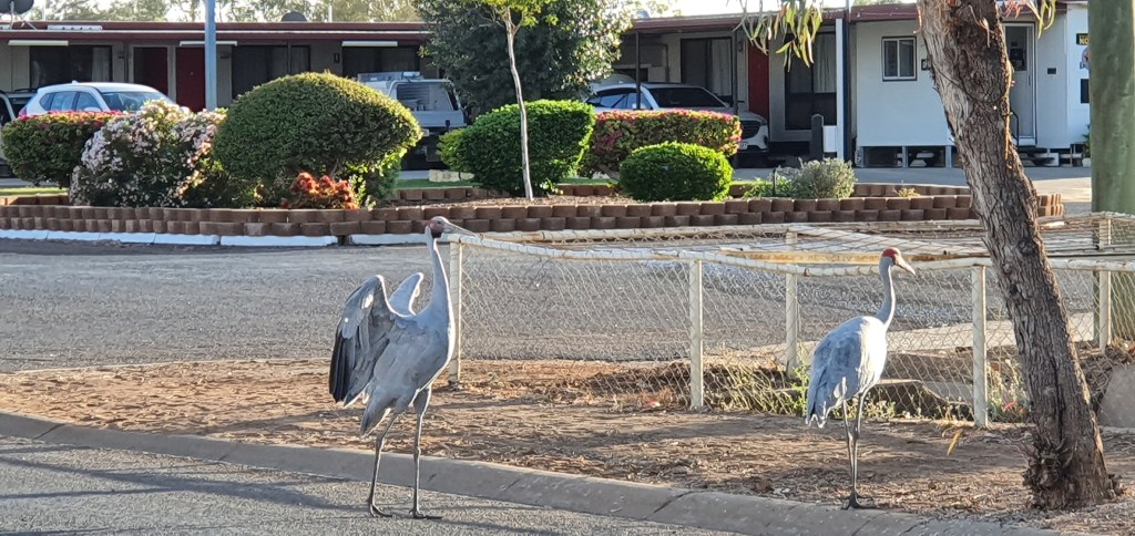 We’re amazed by the richer country that we pass through, with healthy looking cattle and sheep – they are apparently very proud of their ‘droughtmaster’ cattle, as we approach Winton. Here’s another town where we see everywhere the unflappable (pardon the pun) brolgas making their stately way through the streets.