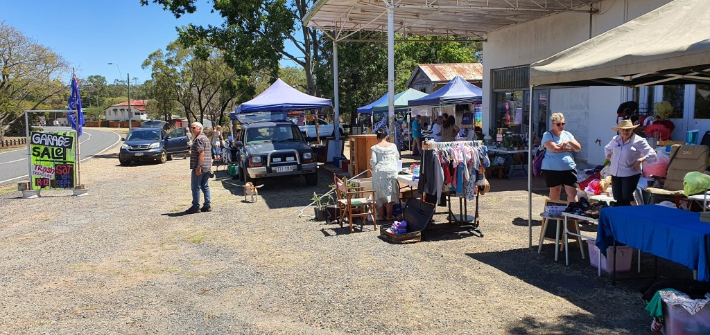 With the undergrowth still increasing, mile after mile, we are transiting through tiny Mt Morgan, just when there’s a garage sale in the main street and an aboriginal band playing around the corner – must stop for coffee!