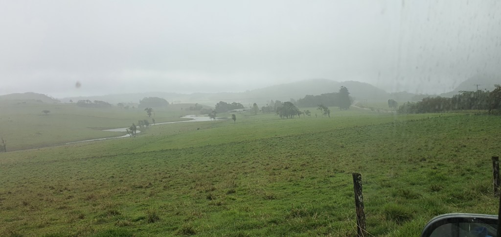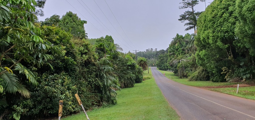 Then the surroundings miraculously changed, the trees were green, there was undergrowth, also green, the undulations in the road started to be noticeable – there were crests and hollows – we’d forgotten in the many weeks in the plains, that such things existed, so came as a surprise – oh look, there’s a hill coming… we’re approaching the Atherton Tableland, from the west and the cattle are looking fat and well-fed.