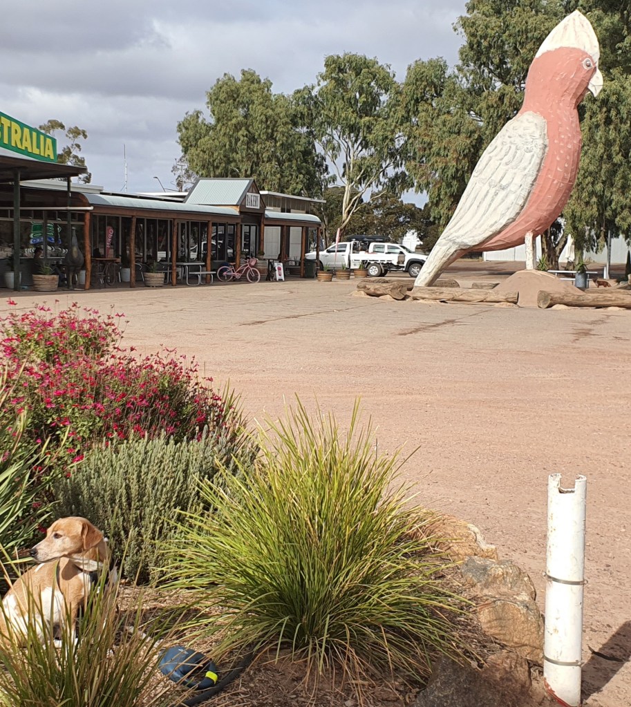 18th-21st April, 2021 Kimba: …such a sweet little town that we stay longer than intended. It’s full of colour – there are murals on many buildings, a huge one on the giant wheat silos and the school children have even painted their front fence with achievements on every picket and graced the playground with ceramic sculptures. There are two or three art houses in Kimba and every single person is super friendly. Apart from the giant gallah (I already knew a few of those) we find the sign that confirms we are already half way across Australia! We ride our bikes around the town, spend too much money on eating and jewellery (we’re in jade territory) and leave a little sadly – but we’re heading into oyster land, the Eyre Peninsula.