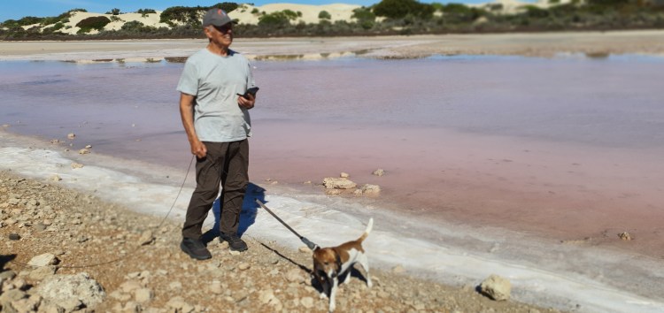 Now there’s a famous Pink Lake in Western Australia, which we hear is not pink any more, but Jim tell us there’s one in South Australia as well. So we find ourselves in a VERY corrugated road for far too long to find SA’s Pink Lake, a salt lake on the edge of the Southern Ocean. Charlie is keen in his Jack Russell way, as usual, to get out of the van when we arrive there, but when I open the door he shrinks back from the hard stony ground “You think I want to jump down THERE? You have to be kidding!” – has to be lifted down. Spoilt dog? Nah, not really.
