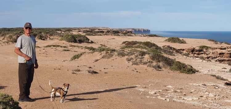 April 29, 2021, Bunda Cliffs, Border Village to Cocklebiddy: Sure enough, the small quantity of fruit and vegetables that I couldn’t cook up – a lemon, an onion, the remains of a lettuce – is carried off by the police at the border. We have our digital passes ready, however, so make them very happy.