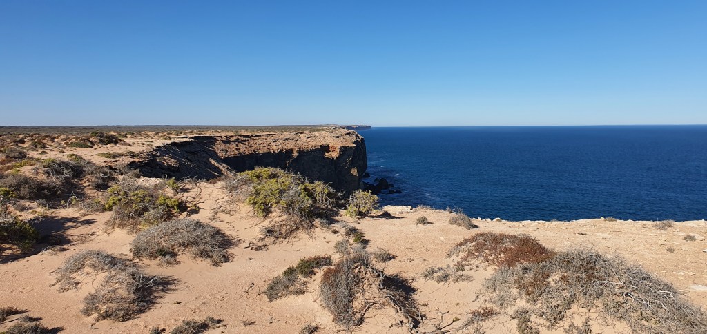 Next we’re headed for the Bunda Cliffs, a hundred metres high, facing the Southern Ocean, one of the few places where you can drive right to the shore. The way is either salt bush country or wheat fields, but mostly desert vastness.