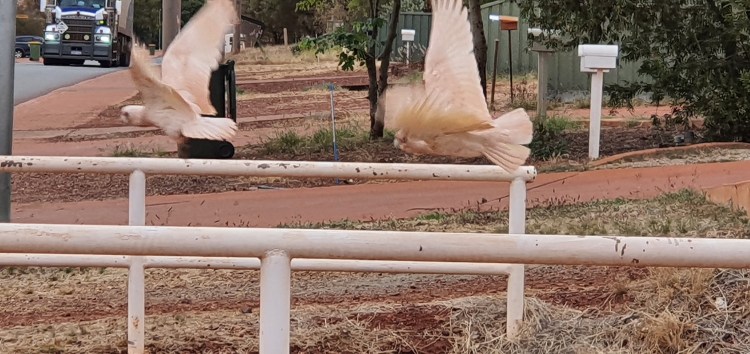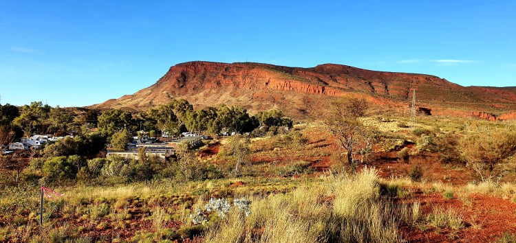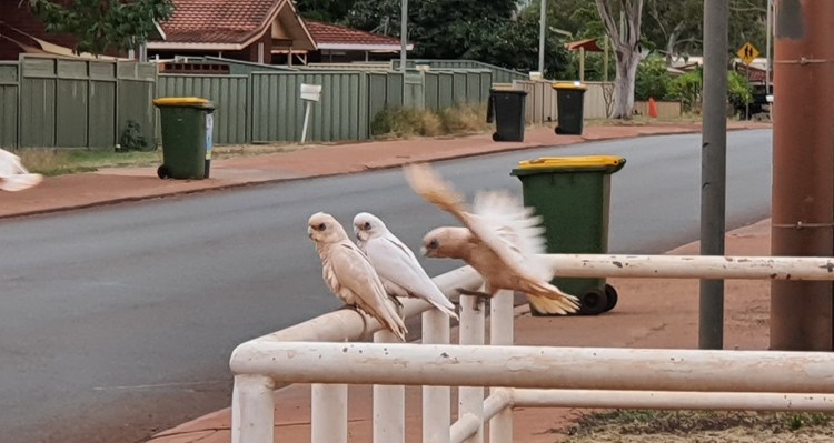 Newman, a rusty town. The roofs are covered in fine rust, the concrete gutters are rust-coloured instead of the original gray concrete shade, the ‘white’ traffic lines on the bitumen are – yes, rust coloured, and even the cockatoos have rusty feathers. Soon, our solar panels are rust-coloured and – there’s nowhere to stay, because BHP has purchased the only two caravan parks in town to use for their fly-in-fly-out workers.