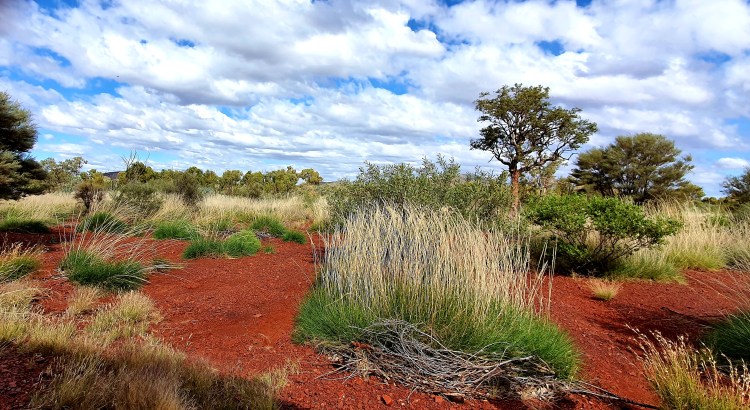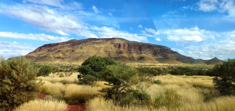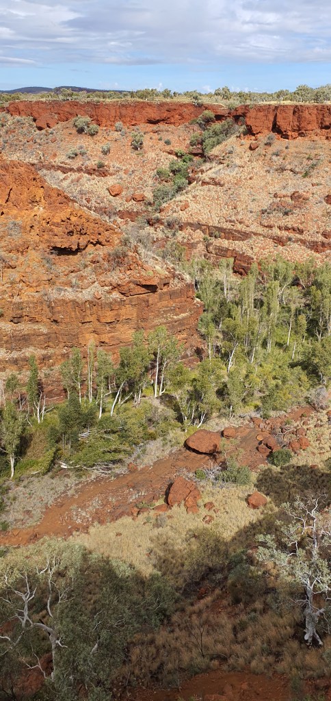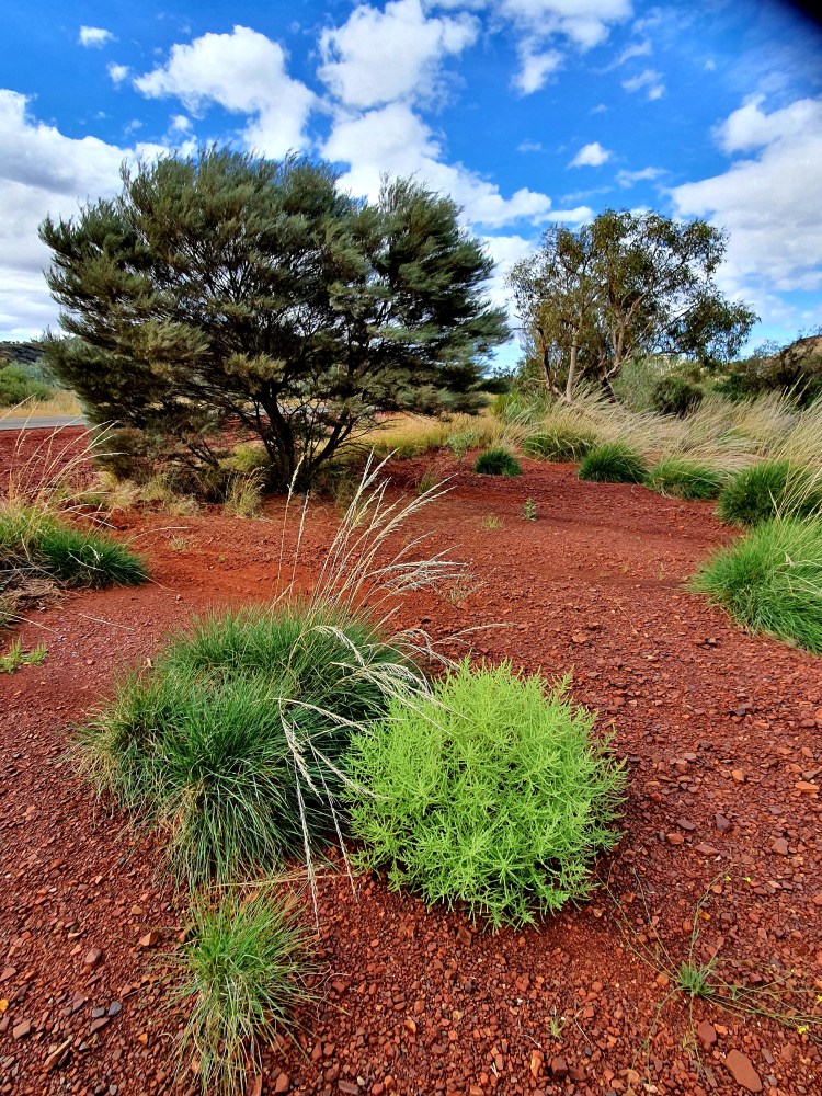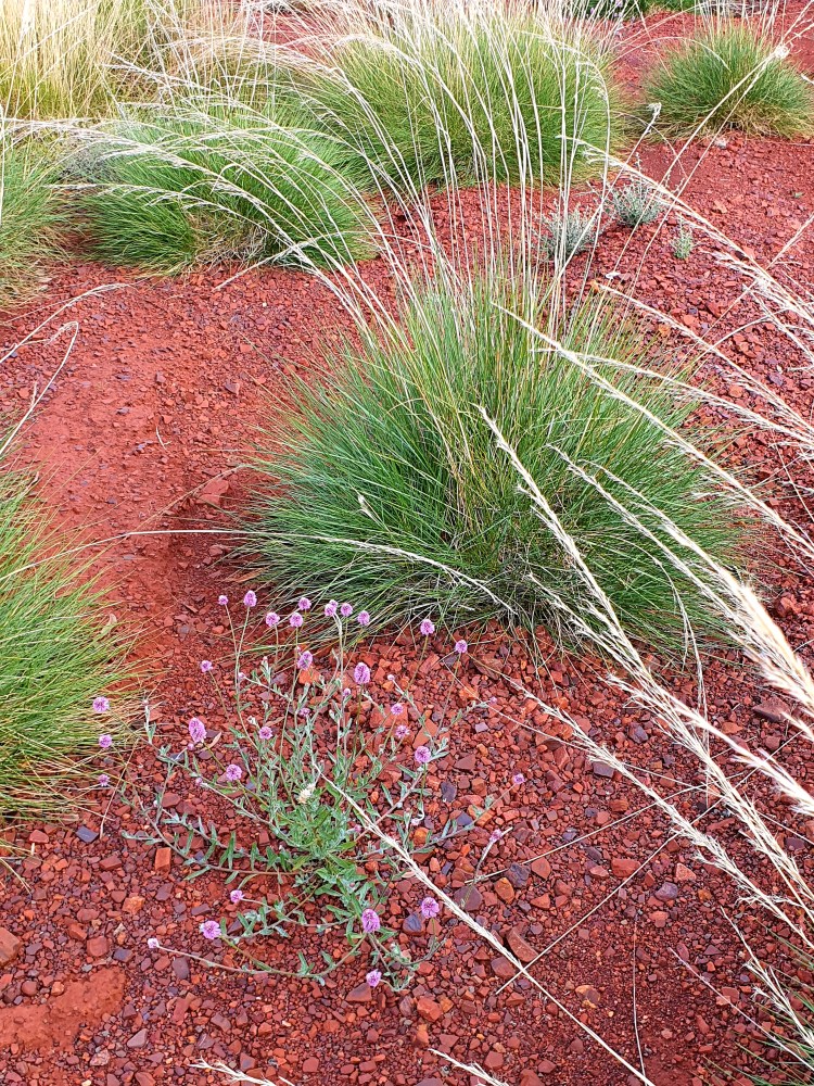To get to Tom Price, our next stop on the way back to the coast, we must drive the main road through Karijini National Park. We already notice the difference – there’s NO introduced European grass! There are miles of spinifex, those elegant bushes as round as half a planet, bright green, with their long yellow tassels – the ‘Pilbara Spinifex’. Then there are many kinds of ground cover between the trees, also usually cylindrical, growing out of the pebbly red earth. It’s almost an alien world. None of the plants are familiar – we feel as though we have landed in a space odyssey somewhere in the universe.