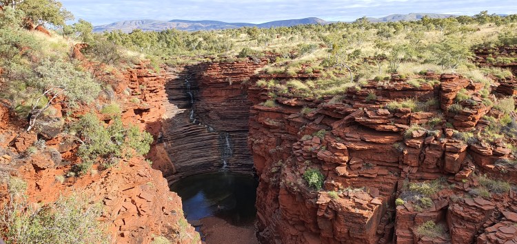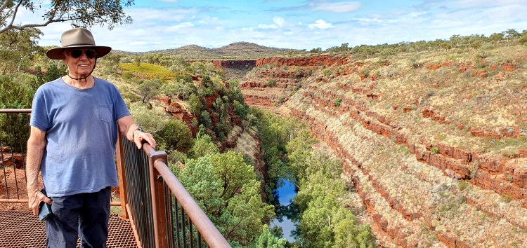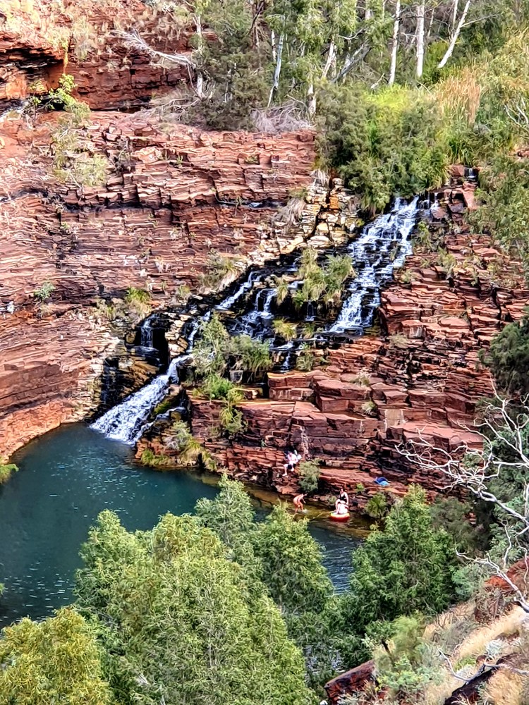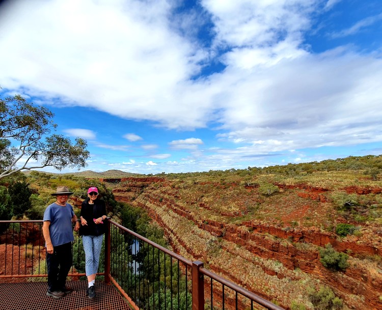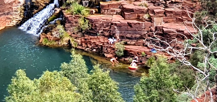 Karijini is equal to any of the world’s great geographic sites, certainly any I have seen, even with the greatest ambition, with the added benefit of never having been overrun by Western agriculture or non-marsupial grazing animals. We visit several sites, all magnificent (Dales Gorge, Kalamina Gorge and Joffre Falls) – I shall have to let the pictures tell the story – they do it much better than I could. You can climb down the rocks in places to swim in the cool waterholes, but recently air stairs were installed as ‘there were too many helicopter rescues!’ We needed at least a week, but we only had a day, as the WA coastline is waiting.