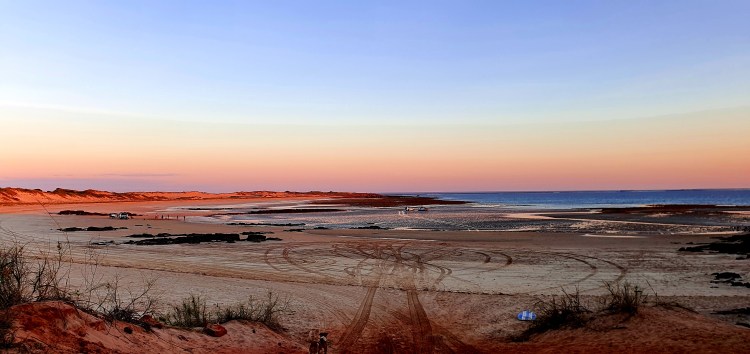 We’re camped among lush vegetation the beach is only metres away and everyone around us are as relaxed as we soon are! How different from Cable Beach, with all its artifices, traffic and tensions, and the sunsets are just as good!